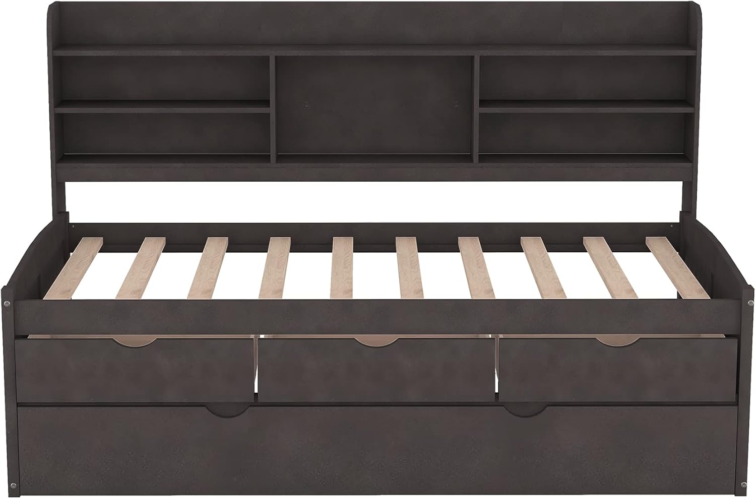Description Twin Size Wooden Captain Bed with Built-in Bookshelves,Three Storage Drawers and Trundle,Antique Gray Crafted of solid pine wood and MDF in a smooth finish, this bed strikes a classic silhouette with a rectangular storage headboard. Functional and inviting, this bed with bookcase headboard and drawers has style and storage in spades. This wooden bed features three large storage drawers, a bookcase headboard, and a t-molding finish. And there is also a pull-out trundle for you to entertain overnight friends or guests. Description Material Pine Wood+MDF Size Twin Color Antique Gray Numbers of Package 2 Spring Box No Need Assembly Required Yes Origin Vietnam Dimensions Overall Product Dimension 77.5''L*88''W*47.2''H Package Dimension Please refer to the Specification Bed Inner Dimension 74.8''x 39.4'' Total Height 47.2'' Number of Bed slats 10pcs Overall Product Weight 163lb Bed Weight Capability 220lb Recommend Bed Mattress Thickness 6''
